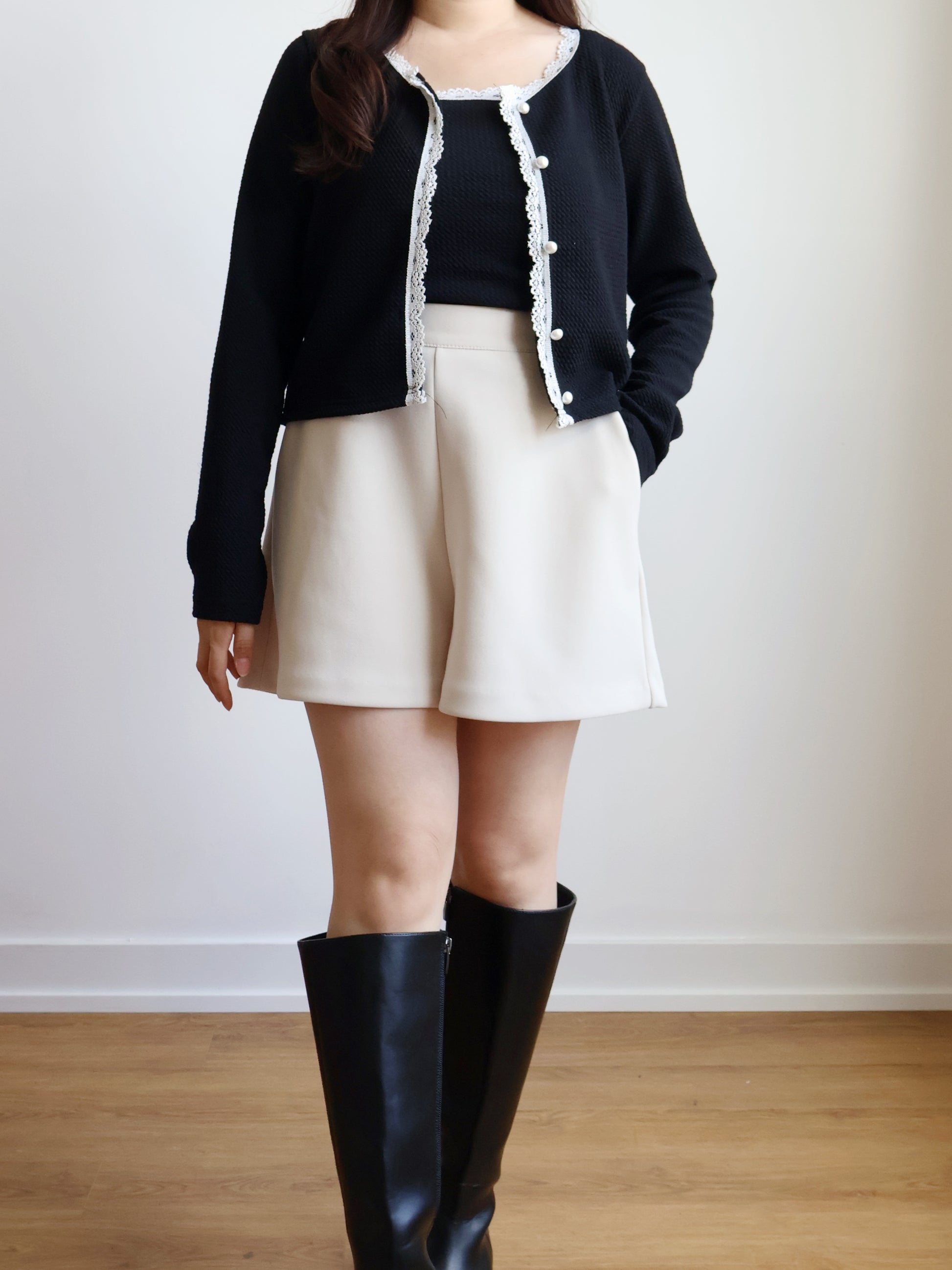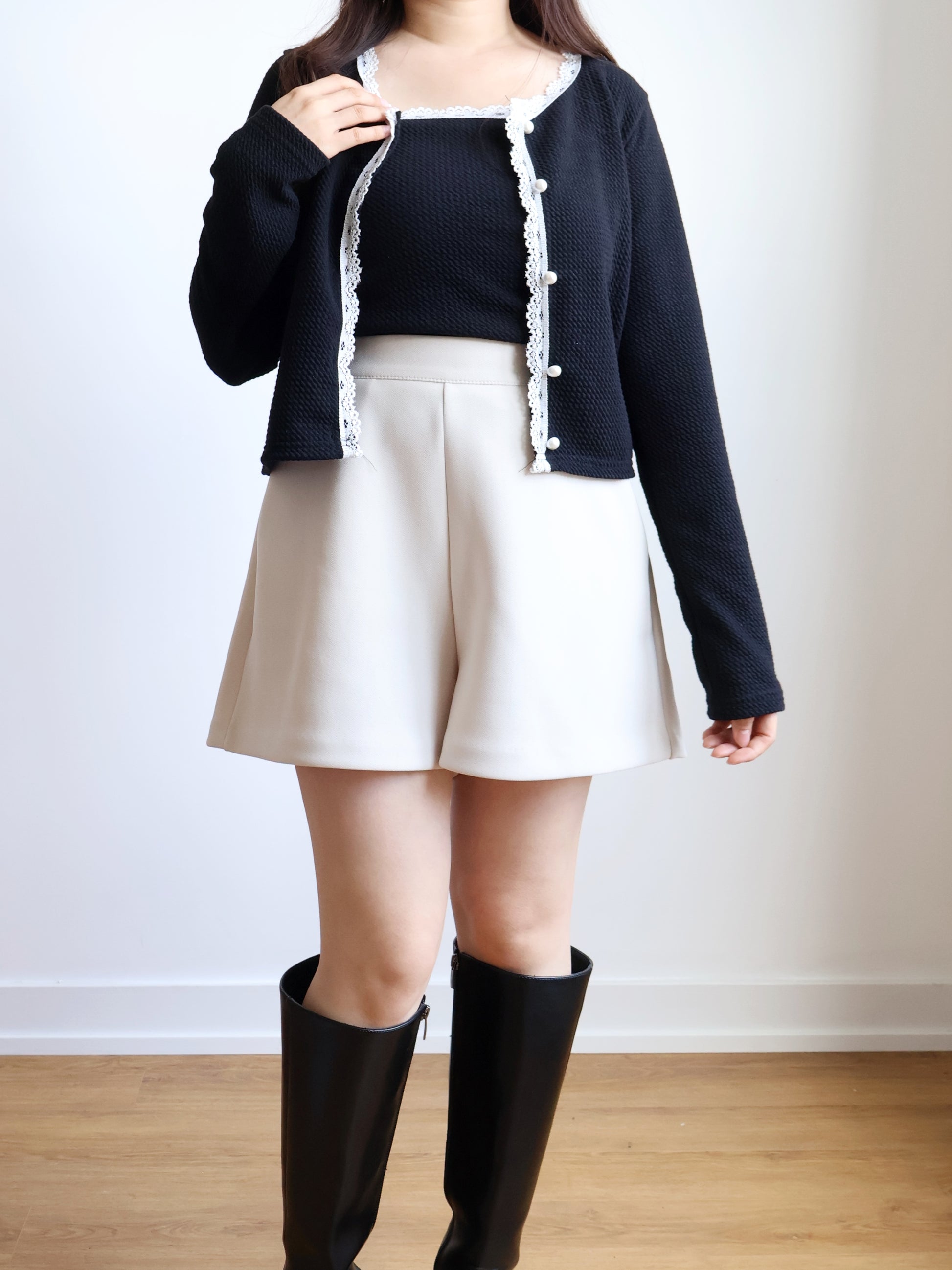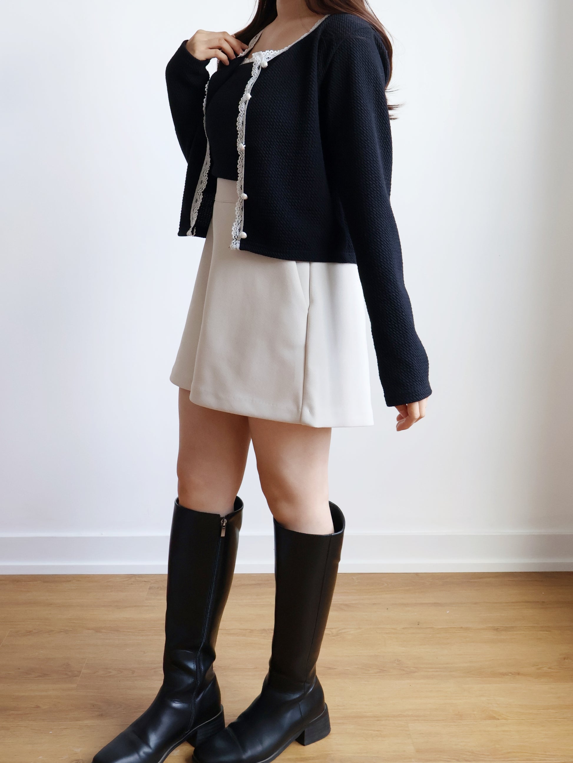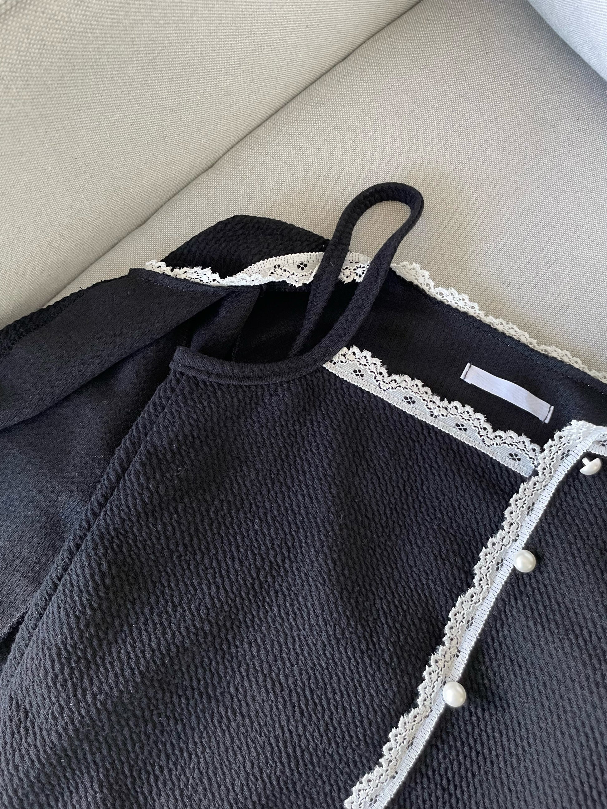 Elegant Pearl Button Lace Trim Two-Piece Set(Black)