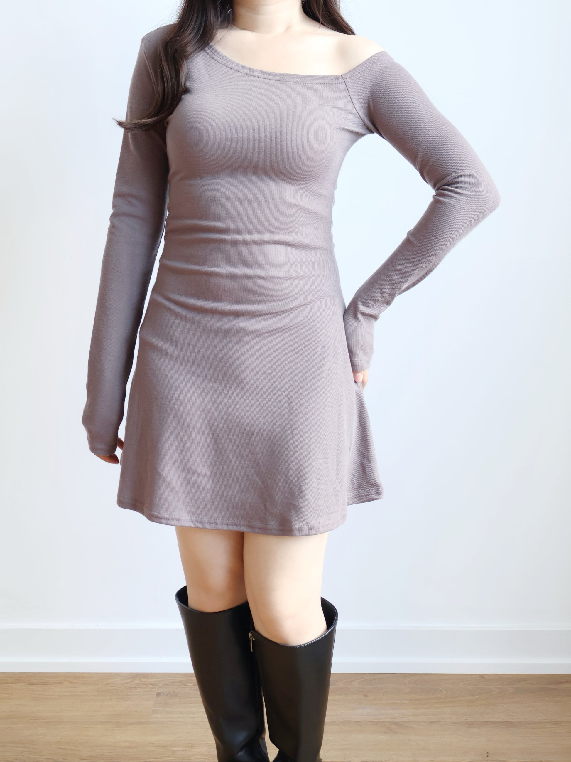 Minimalist Asymmetrical Neck Mini Dress(Brown)