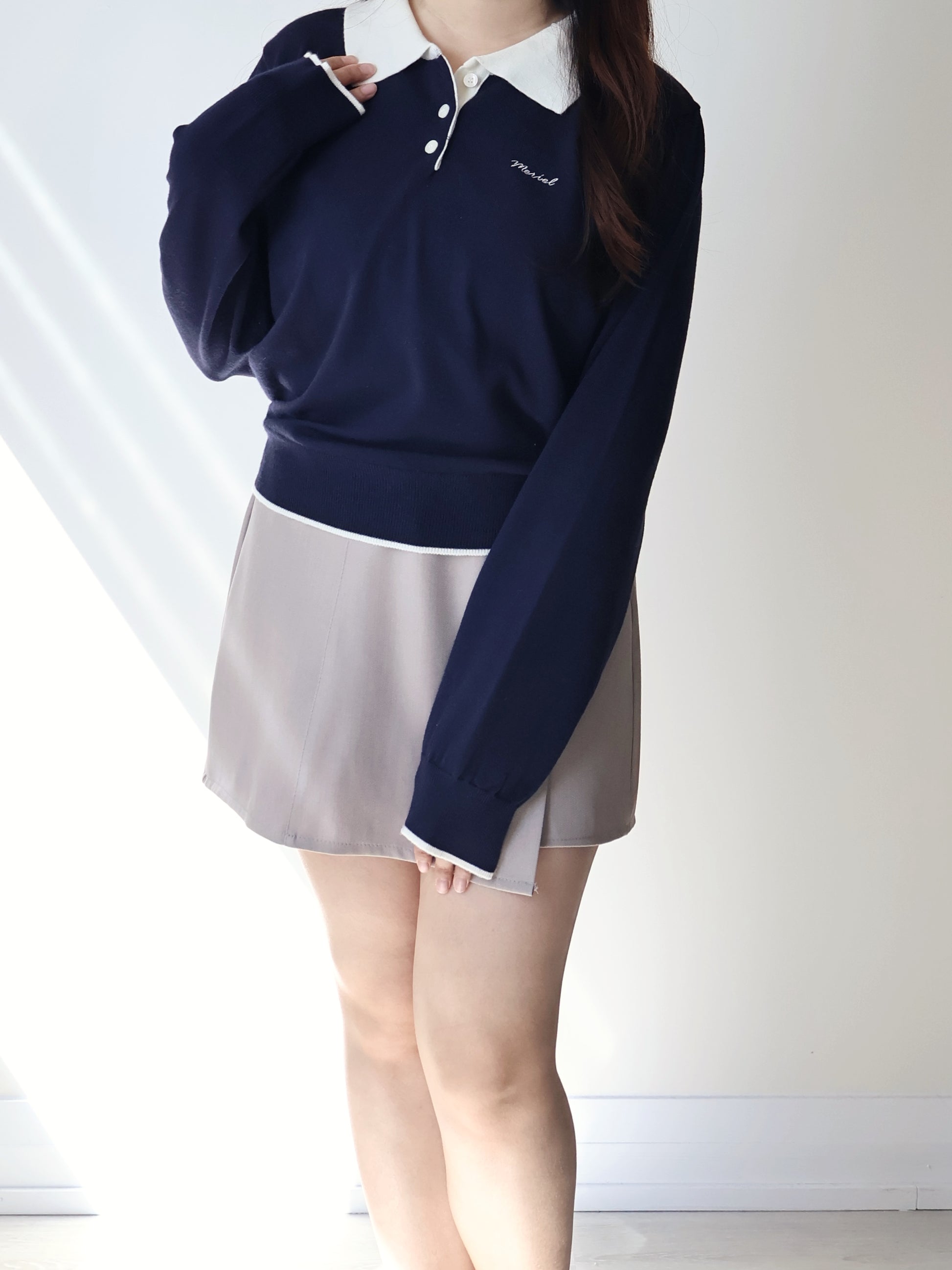 Teddy Collar Colour-Block Embroidered Soft Sweater(Navy)